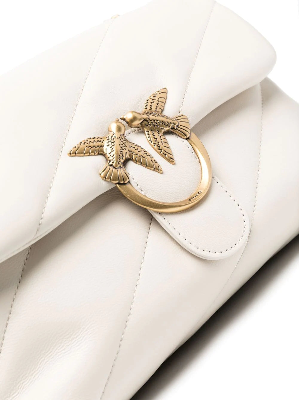 The signature Love Birds buckle on the front of PINKO's Love Classic Puff shoulder bag gives the accessory its iconic name. The logo's unique design represents 'love and freedom, power and light', which characterises the label's aesthetic.