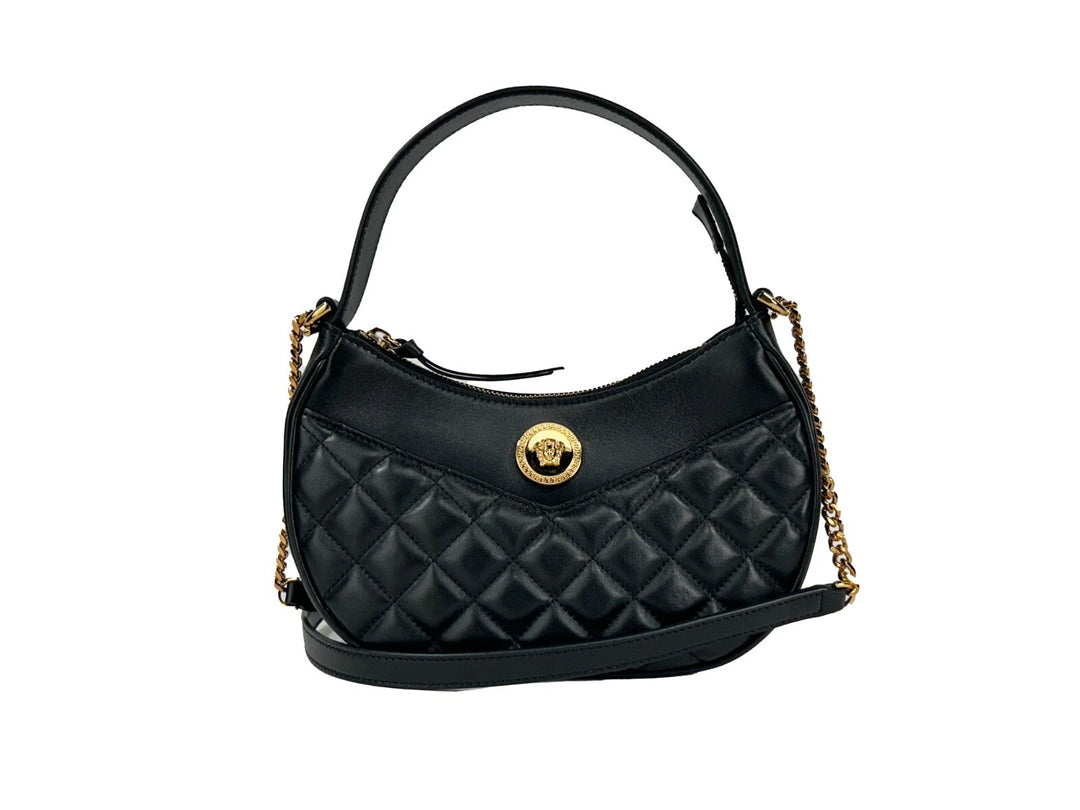 Versace Quilted Black Leather Half Moon Chain Crossbody Bag