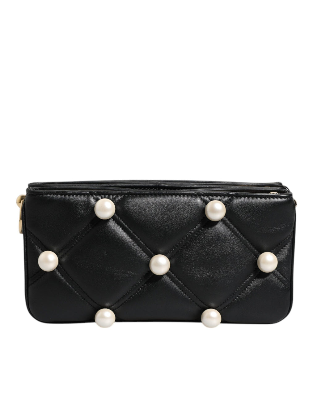 Black Leather Pearl Embellished Logo Shoulder Bag