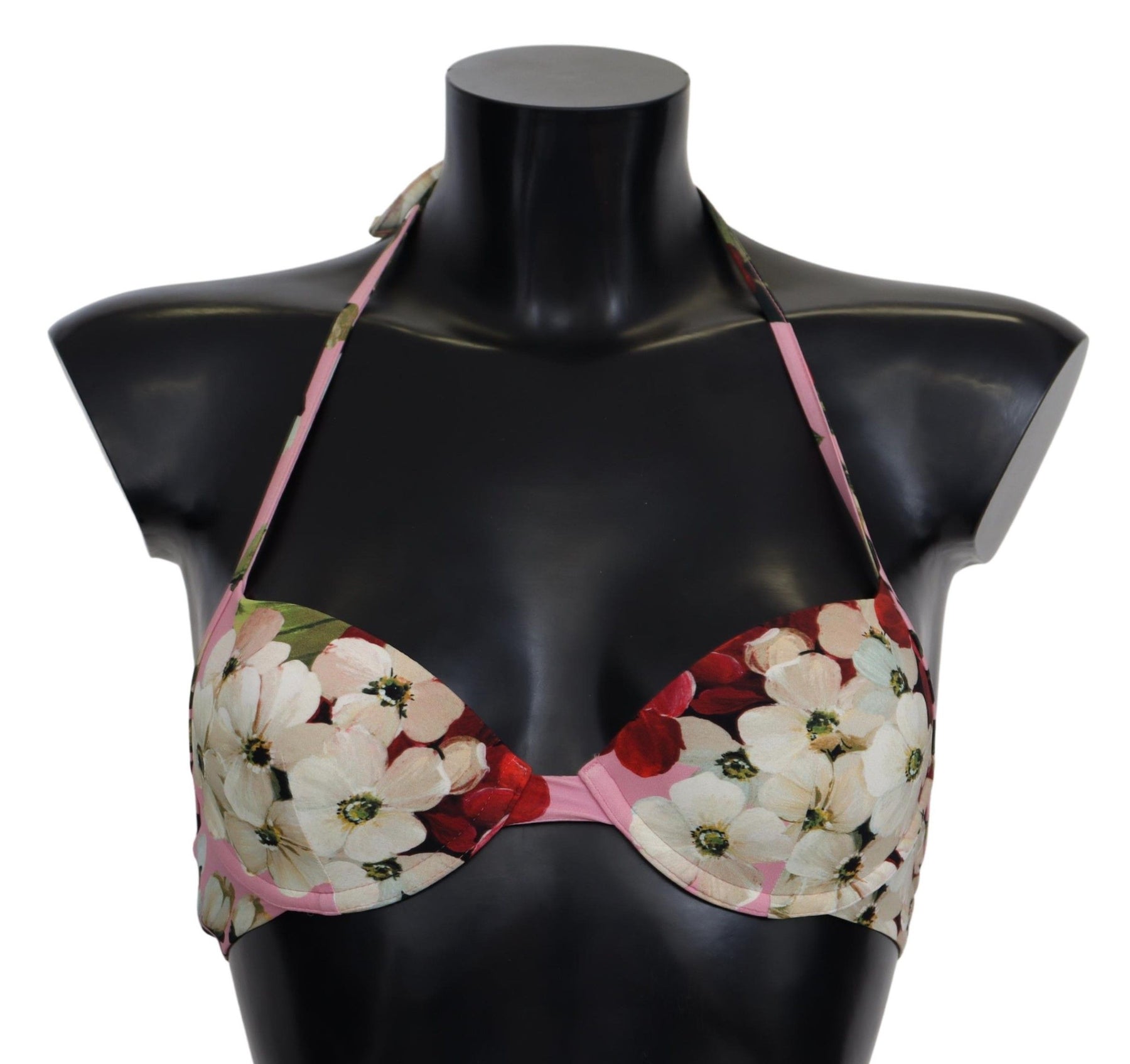Embrace the summer with the luxurious touch of Dolce & Gabbana. This chic Floral Elegance bikini top is not only gorgeous and new with tags, but also radiates authenticity from the esteemed fashion house. Crafted from a blend of high-quality nylon and elastane, it promises both comfort and durability. Its lightweight, elastic material ensures a perfect fit, while the decorative, logo-embossed back closure and neck tie offer a splash of branded elegance. Its vibrant multicolor floral print will ensure you stand out on any beach or poolside. Made with love in Italy, this bikini top is a testament to expert craftsmanship and elegant design.