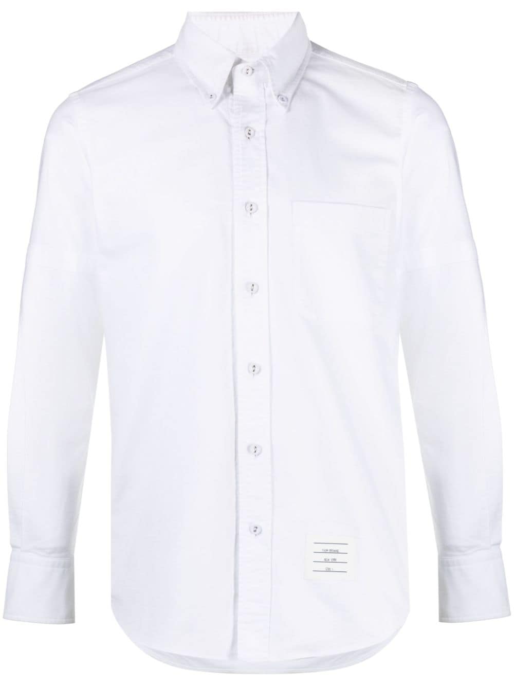 Thom Browne is known for enhancing classic tailoring with signature house hallmarks. A case in point, this blue cotton-poplin shirt is adorned with a grosgrain armband and an RWB loop at the nape.