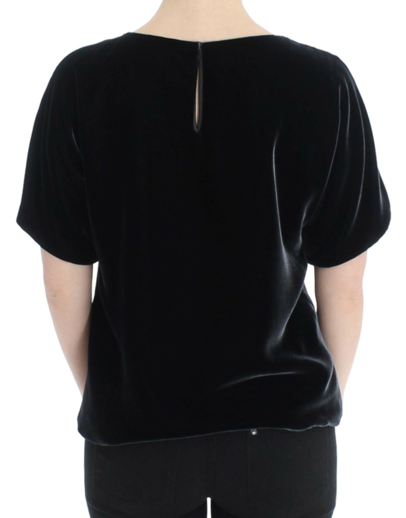Experience the luxury of Italian craftsmanship with Dolce & Gabbana’s enchanting black velvet short-sleeved top. A silhouette that blends sophisticated charm with modern elegance, it is perfect for a polished look. The top features a classic crewneck, a convenient back zipper for ease of wear, and the iconic logo detail that speaks to the brand’s elite fashion status. Perfectly tailored with a blend of silk and viscose, it offers both comfort and a luxurious feel.