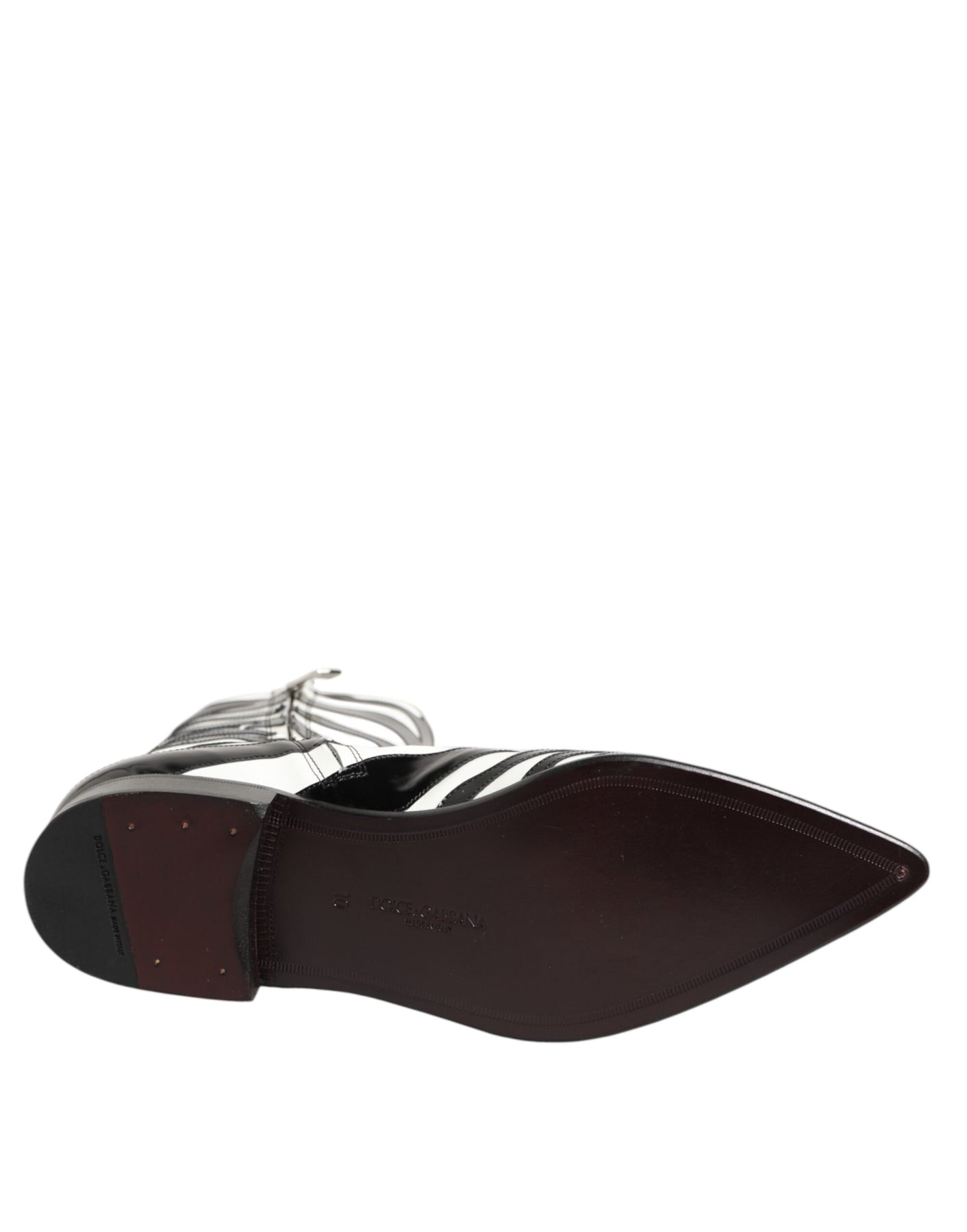 mid calf boots featuring a bold black-and-white zebra pattern. Designed for a fashion-forward edge, they offer a sleek, elongated silhouette that instantly elevates any outfit. Perfect for adding a touch of wild sophistication to both casual and evening ensembles.