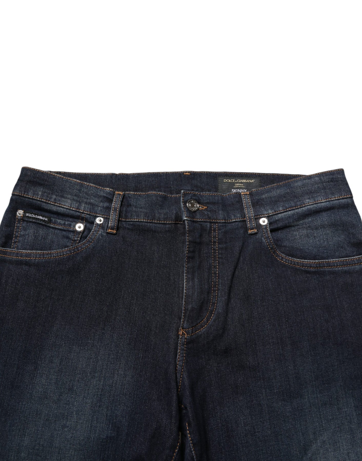 jeans are tailored in dark blue cotton denim with a sleek skinny fit that emphasizes a modern, streamlined silhouette. Designed with a mid-rise waist, five-pocket styling, and a zip fly with button closure, they combine classic craftsmanship with contemporary appeal. A versatile wardrobe essential that easily pairs with both casual and refined looks.