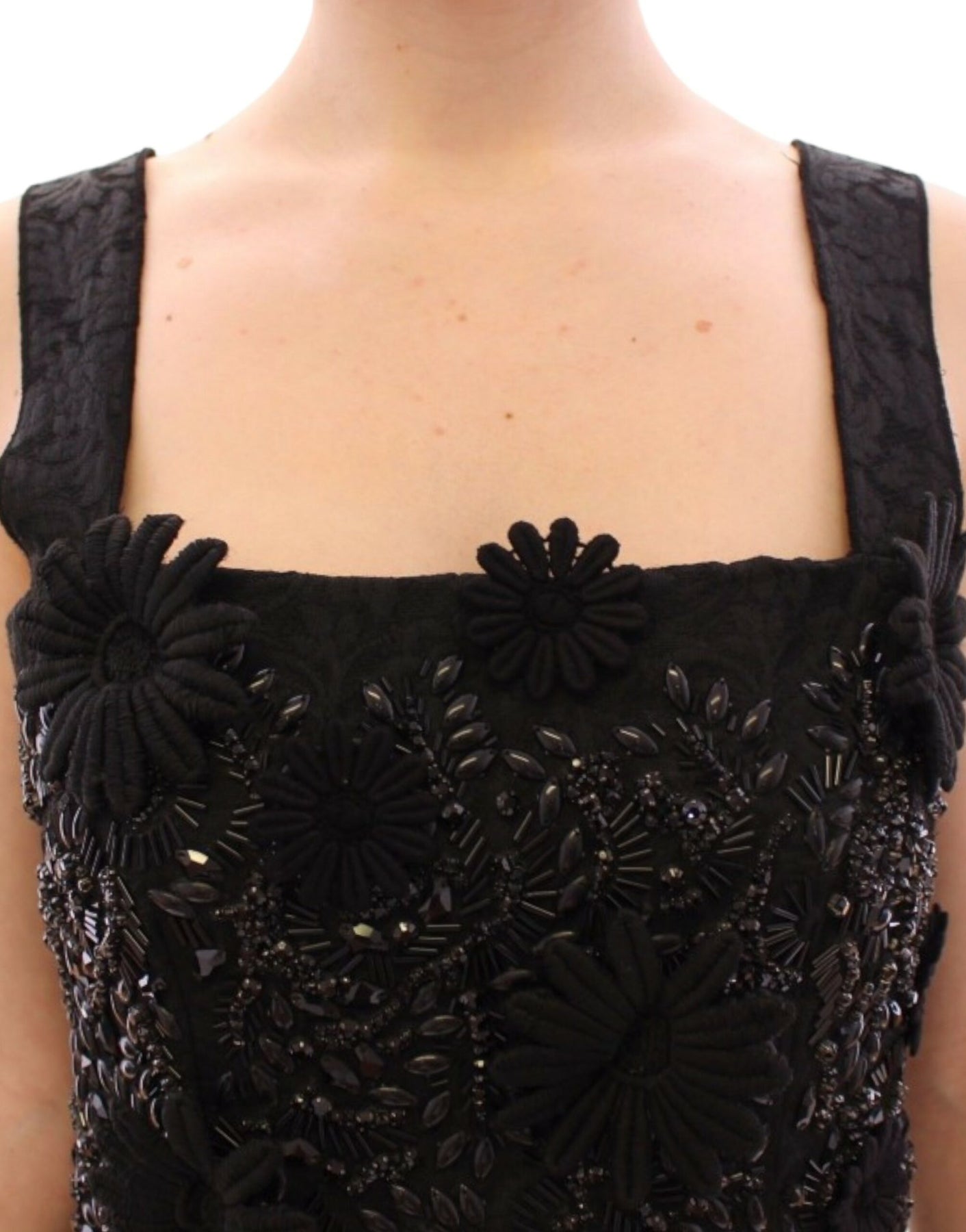 Discover the epitome of opulence with this stunning Sequined Mini Shift Dress by Dolce & Gabbana. A perfect amalgamation of high-end fashion and intricate detailing, this black dress boasts a breathtaking Sicilian-inspired design with an array of sparkling crystals and sequins. Fashioned from a luxurious blend of materials and crafted with meticulous precision in Italy, it features a flattering above-knee length and a sleek silhouette. Presenting a stunning addition to your evening wear, it exudes a blend of modern elegance and timeless glamour. Complete with a silk stretch inner lining for the highest comfort, this creation is not just a dress, but a statement of luxury and sophistication.