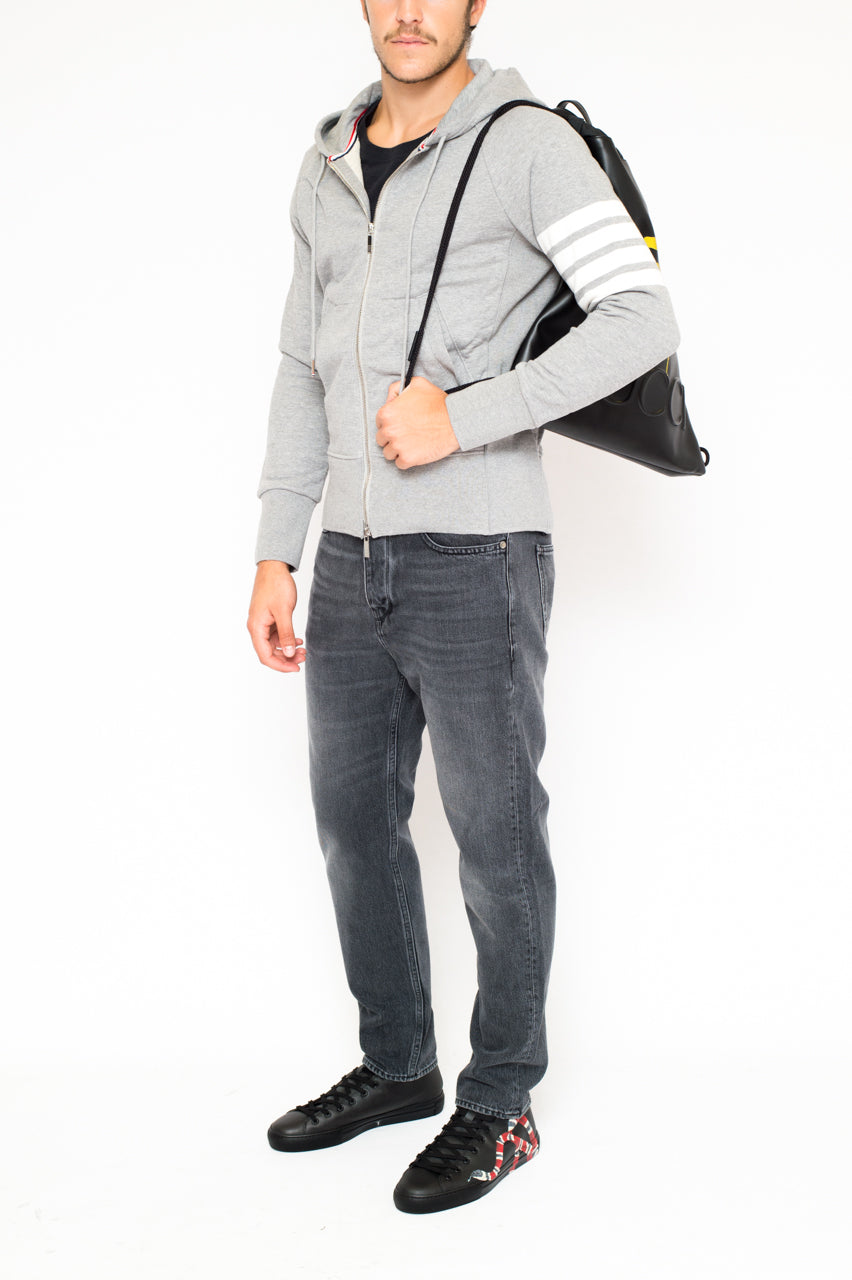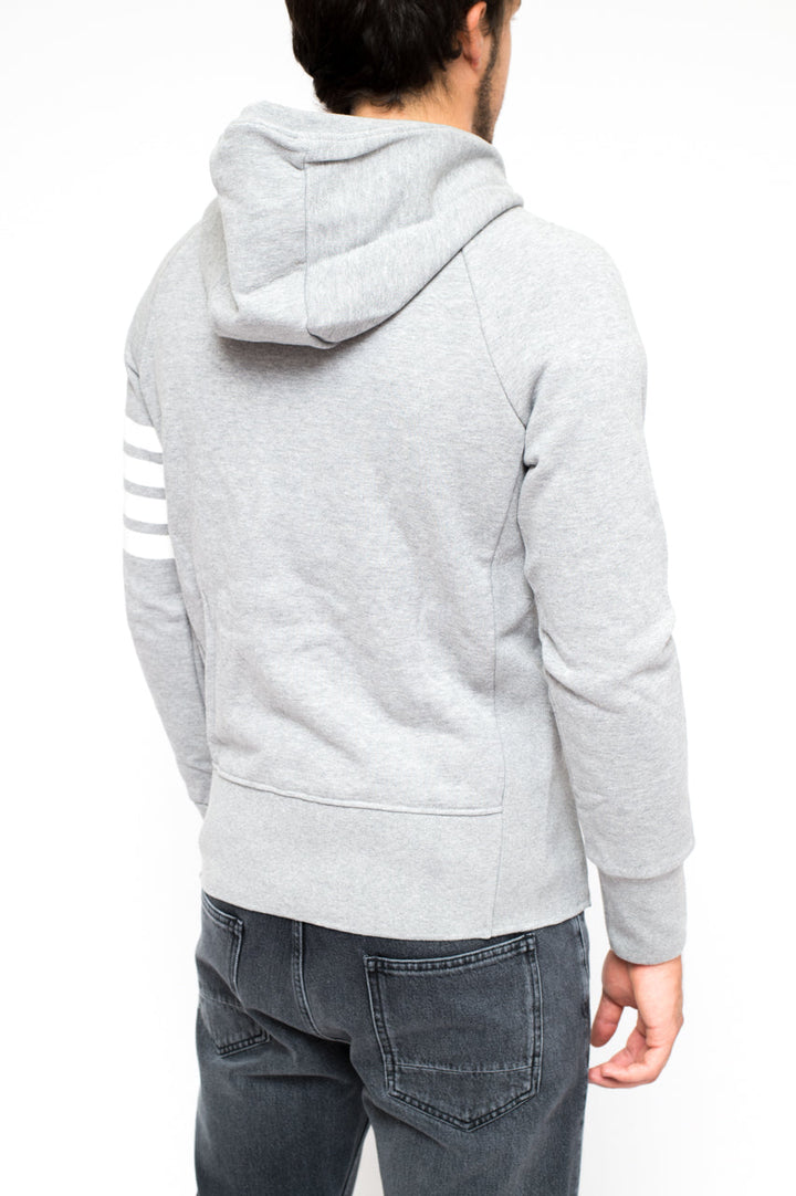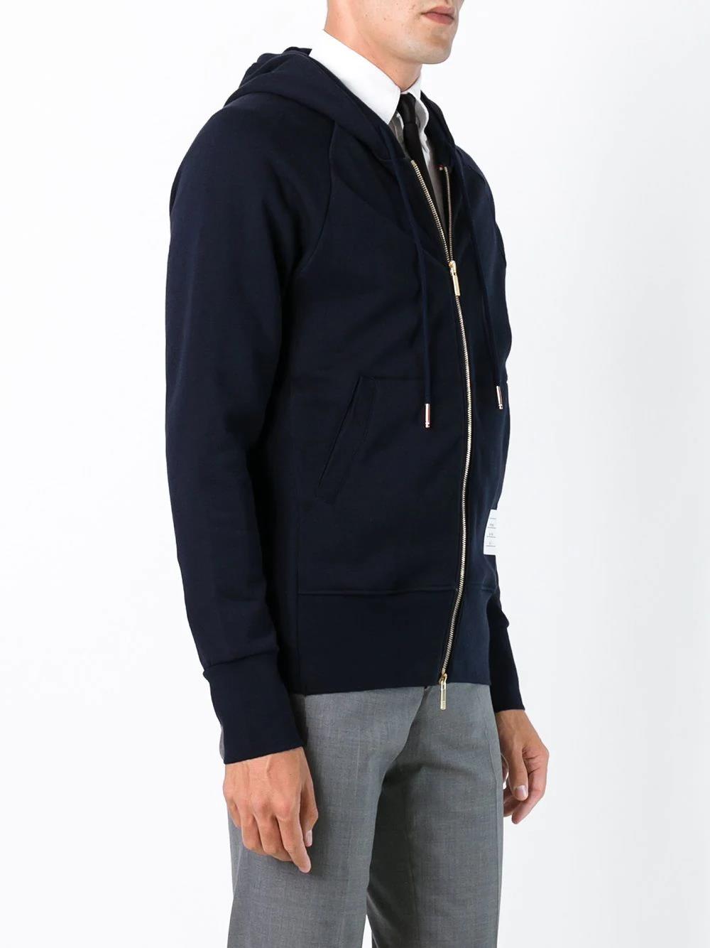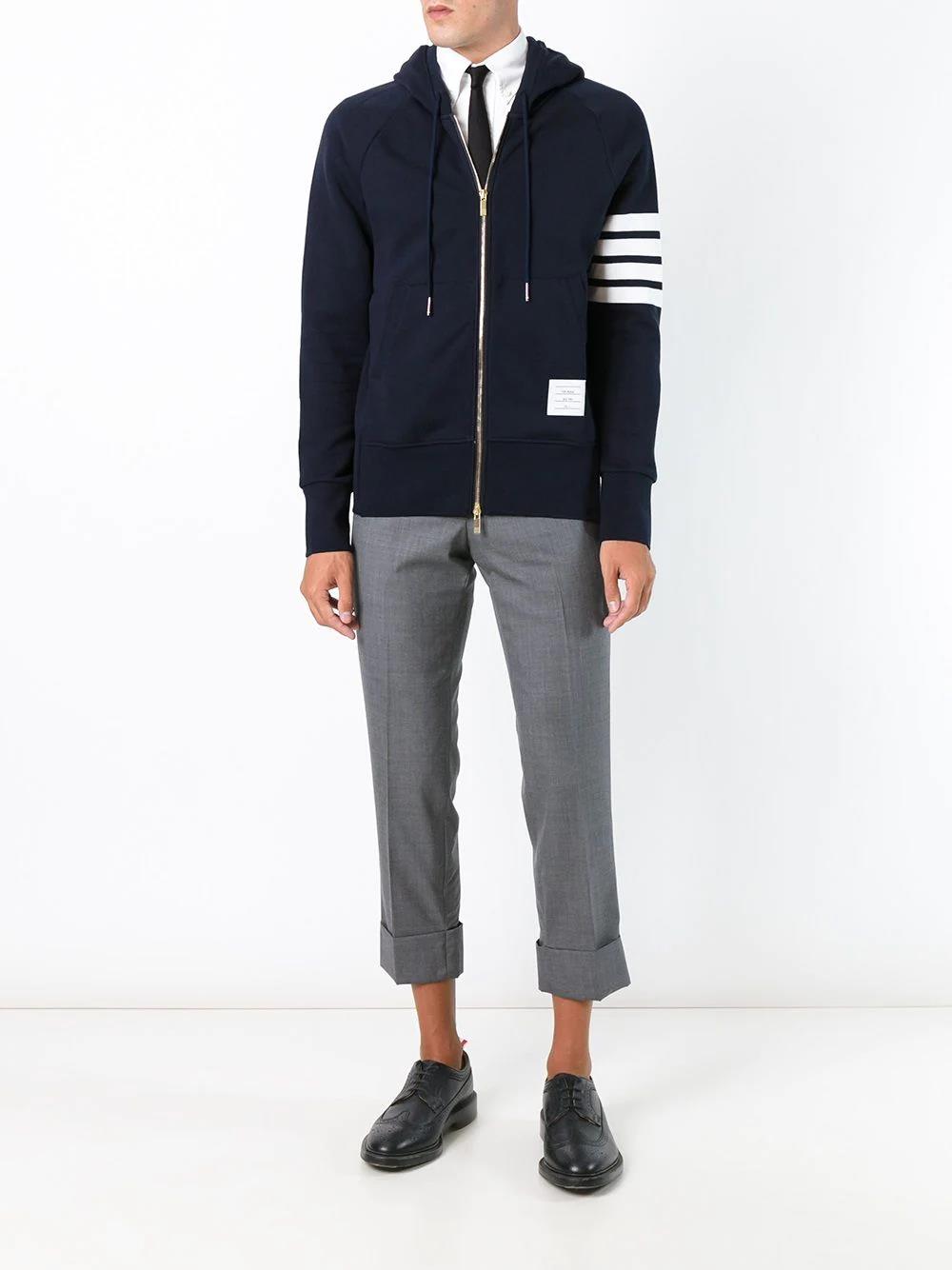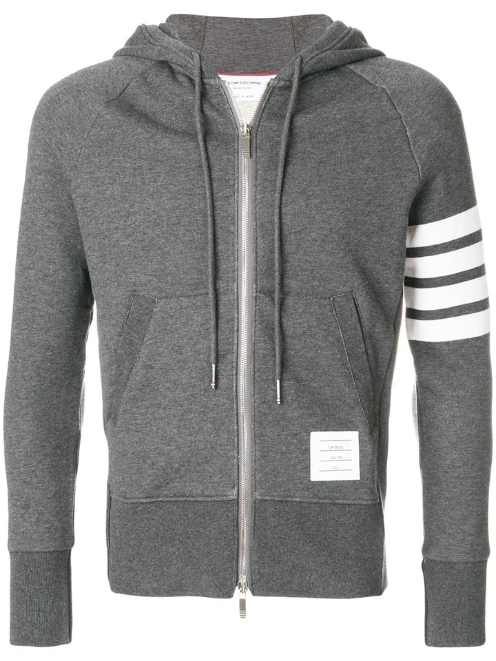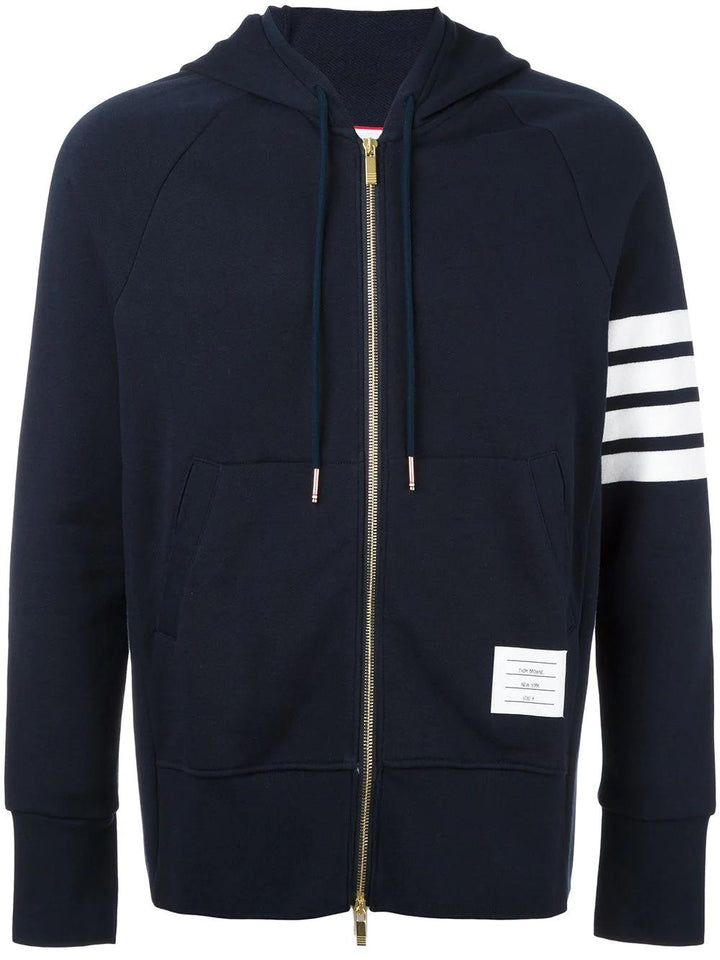 Introducing...your go-to hoodie. With Thom Browne's engineered 4-Bar stripe detail and a logo patch to the front, this is a piece that you'll reach for again and again. Stay warm in style. Featuring a drawstring hood, a front zip fastening, long sleeves, two front pockets, a front logo patch and a 4-Bar stripe.