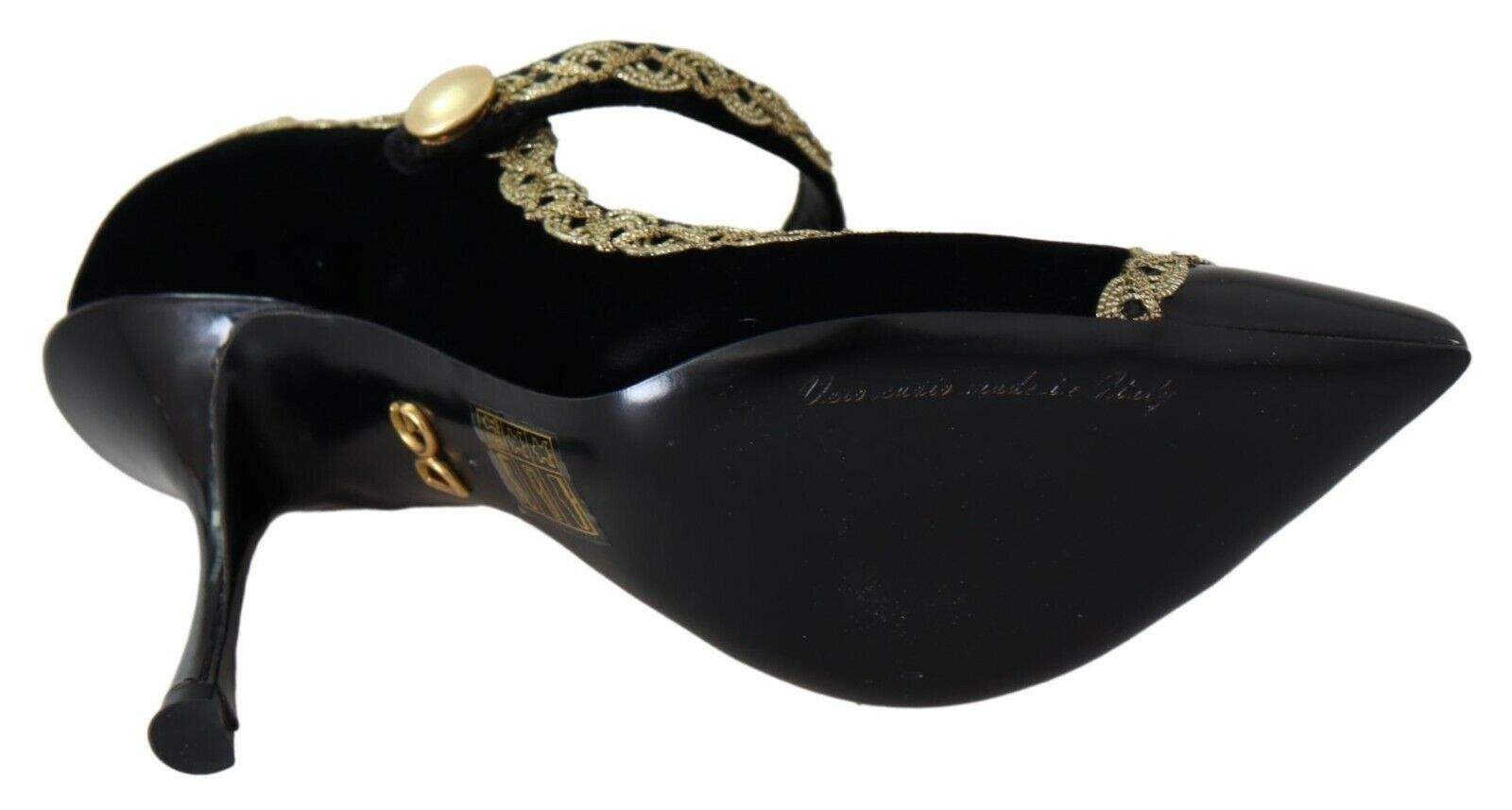 Gorgeous brand new with tags, 100% Authentic Dolce & Gabbana Classic mary jane pumps in plush black velvet patent with the label’s iconic gold embroidery along the uppers. Pointed toes. Gold-tone studded ankle straps. Stiletto heels.