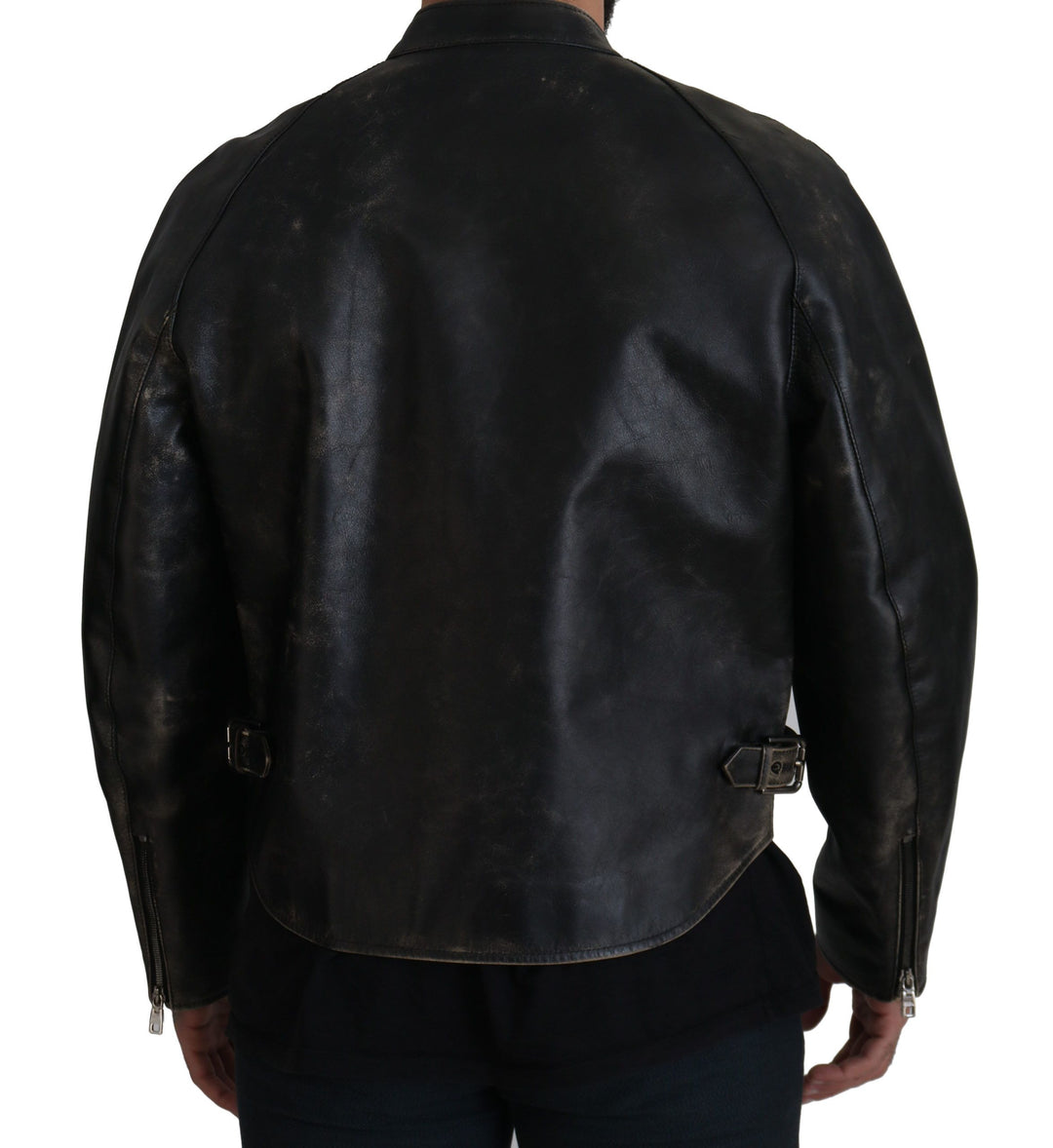 Indulge in the epitome of luxury with this stunning black leather jacket from Dolce & Gabbana. Renowned for their exquisite Italian craftsmanship, this 100% authentic jacket is a testament to high fashion and unparalleled style. The sleek black hue is accentuated by striking silver metal detailing, providing a distinguished look perfect for any sophisticated ensemble.
