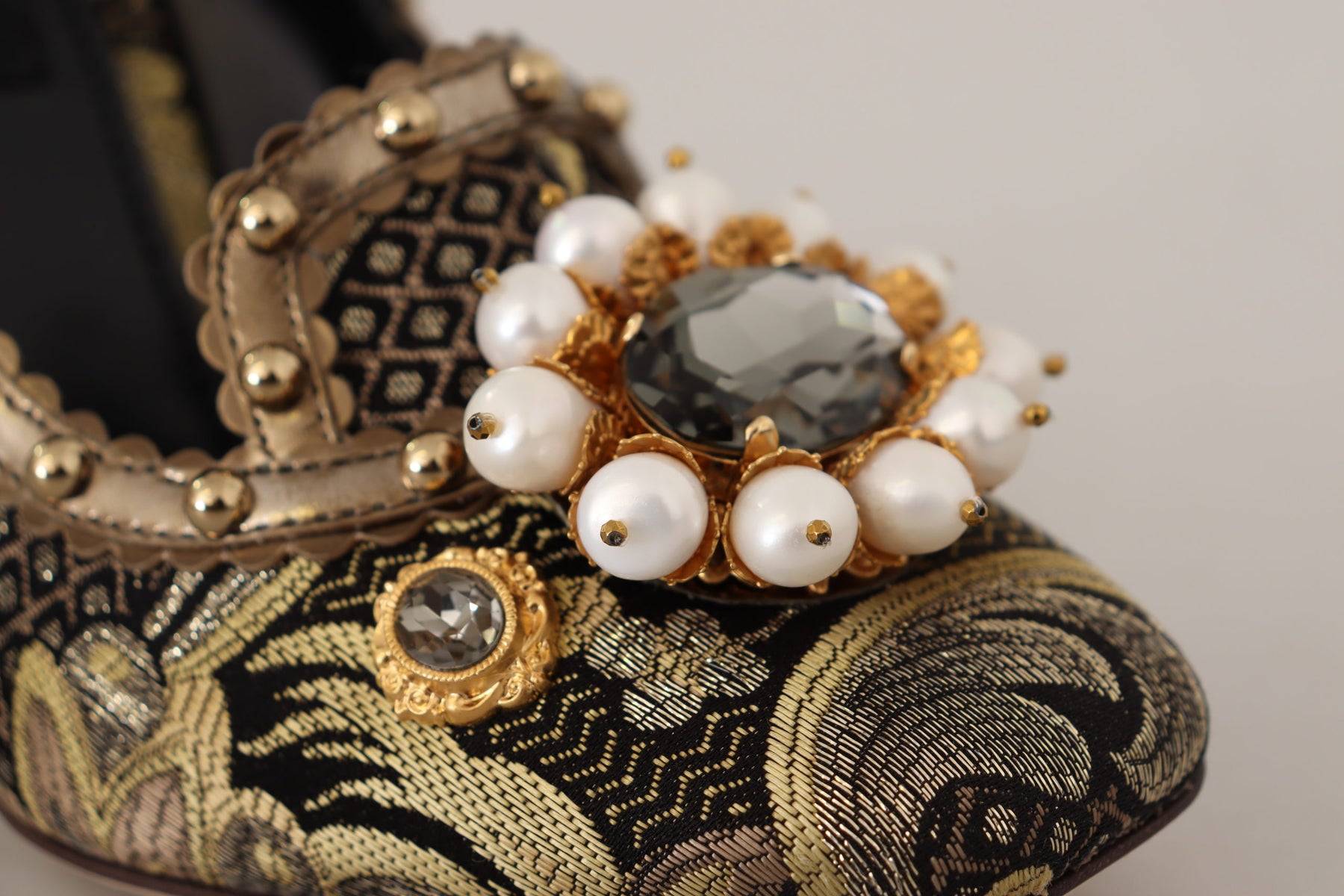 Step into luxury with these exquisite Dolce & Gabbana jacquard brocade square toe pumps. Adorned with pearls and studs for a touch of opulence, they sit atop a sturdy block heel. A perfect blend of style and comfort, designed to elevate any ensemble. Crafted in Italy, each step reflects the premium quality and attention to detail synonymous with Dolce & Gabbana.