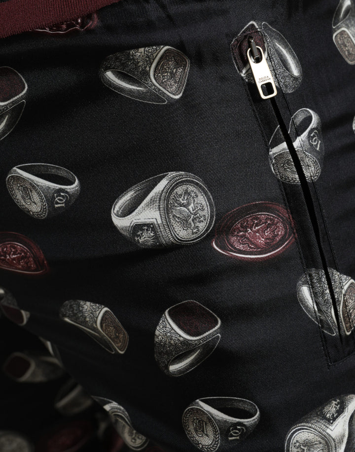 Indulge in the epitome of luxury with our stunning, 100% authentic Dolce & Gabbana pants, freshly tagged and perfect for elevating your casual wear. The trousers feature a sleek black hue, adorned with an eye-catching, multicolor ring print, giving them a unique and upscale touch. Designed for a comfortable, regular fit, these pants are crafted from the finest silk, boasting exceptional craftsmanship straight from Italy. Sporting both front and back pockets with secure zipper closures, an elastic stretch waistband, and an adjustable drawstring, these jogging trousers don’t compromise on style or functionality. Complete with subtle logo details, they’re a testament to high-fashion leisurewear.
