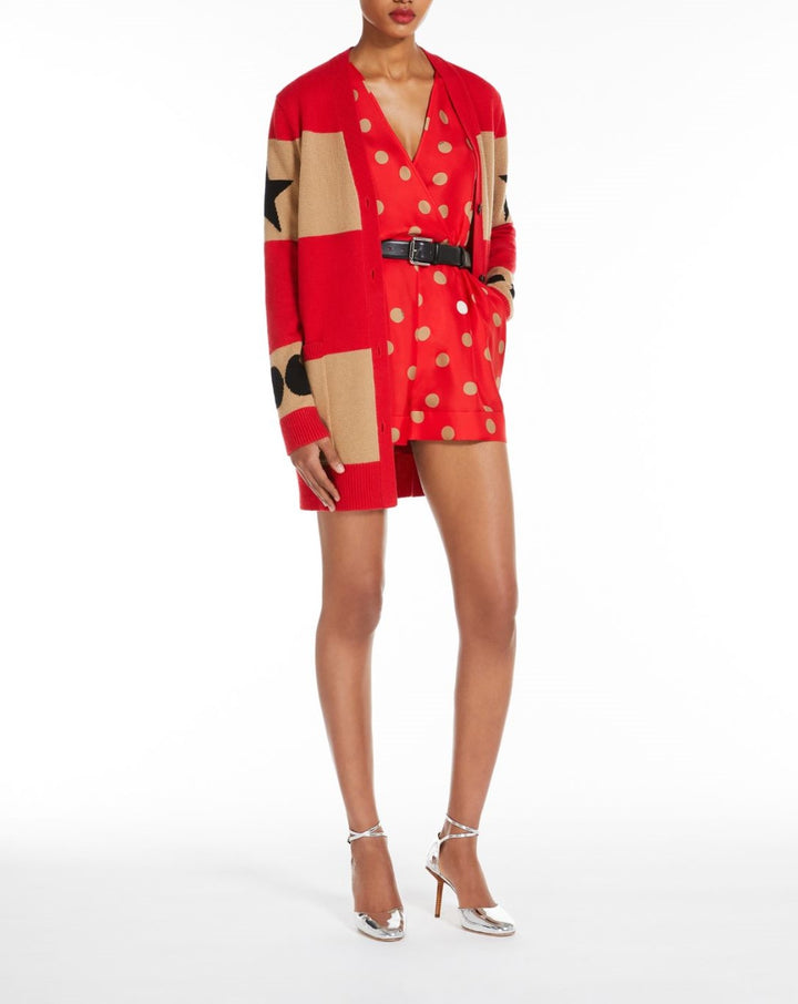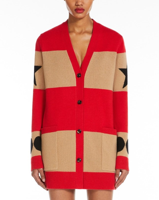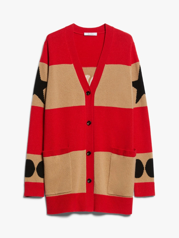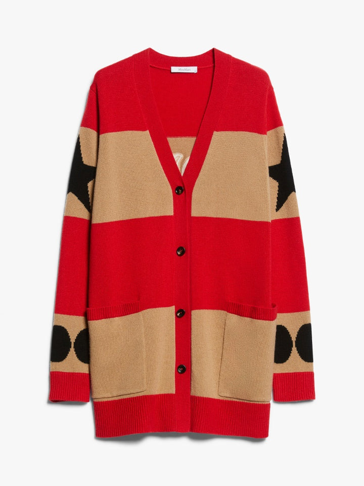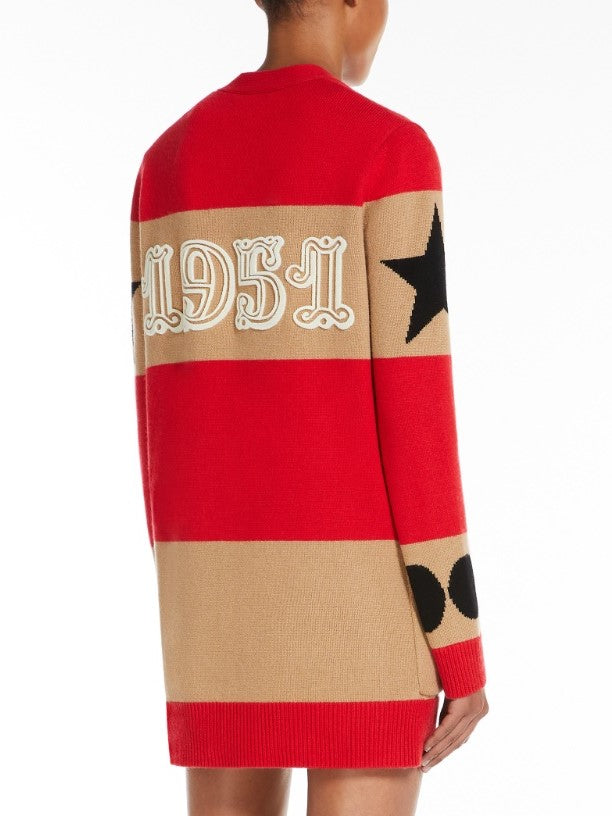 Long cardigan with oversized volume, made of a luxurious blend of wool and cashmere in plain knit. The garment is customised with jacquard stripes, placed designs and contrasting 1951 detail, with characteristic flocked texture, applied on the back. Complete with patch pockets on the front, V-neck and ribbed edges. Front fastening with visible buttons.